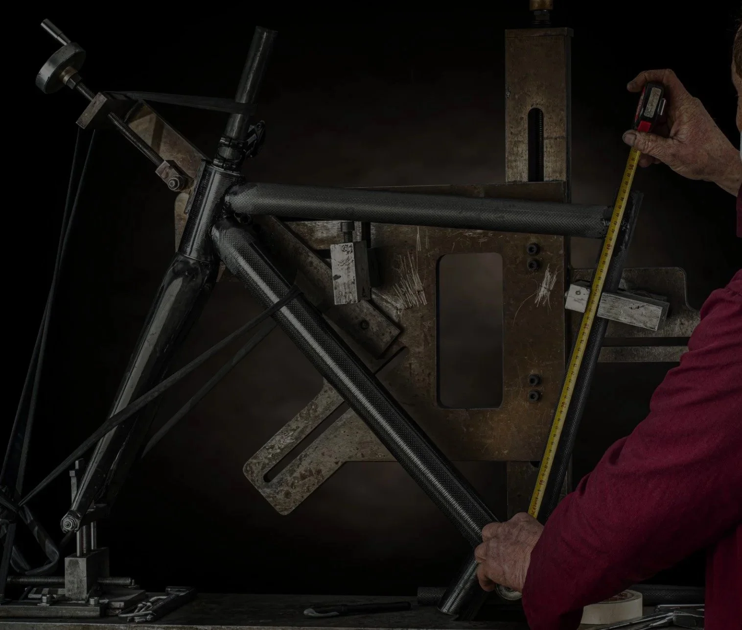 After the design, the real manual work begins: each tube we create is machined, then laid into its mask and custom-cut for the individual rider before being fitted onto the construction jig. Following the pre-assembly of the frame through a sealed bonding process, the vacuum carbon layering process begins — a method that allows us to create a much stronger frame compared to other procedures. Here, we apply the carbon by hand, shaping every junction layer by layer to achieve the precise performance we designed. Finally, the joints are meticulously sanded and hand-finished.